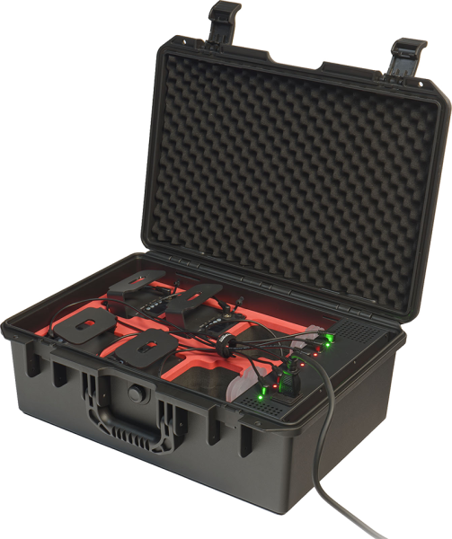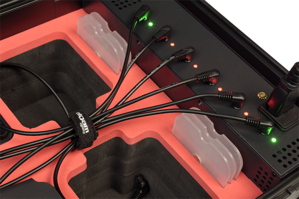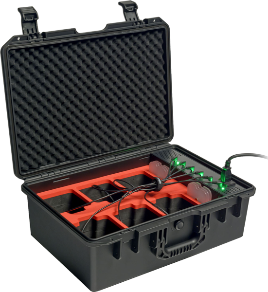 The case features an integrated charging dock that allows you to charge your EVENT PAR 44 QUAD IP LED PAR lights without removing them from the case. Simply plug the dock into a power outlet and connect the lights to the charging dock with the provided cables. A series of LEDs indicates whether charging is in progress or complete by turning green. This convenient feature saves you time and ensures your lights are always ready for use.