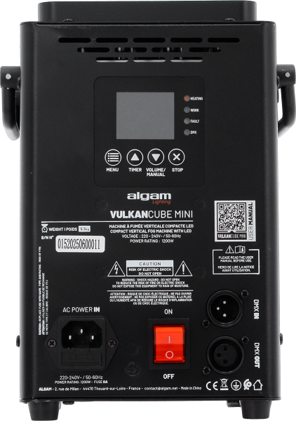 The Vulkan Cube Mini embodies the essence of Algam Lighting's vertical fog machines in a compact format, perfect for mobile entertainers and small to medium-sized stages. Thanks to its 1200W of power and a warm-up time of only 4 minutes, it delivers a dense and homogeneous jet of fog that can reach a height of 5 meters. Its impressive output of 566 m³/min creates an immediate visual impact, ideal for highlighting a key moment, a musical drop, or a spectacular scene change.