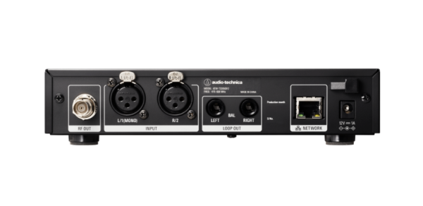 This system includes a rack-mount transmitter with an OLED display and front-panel controls, a portable bodypack receiver with an integrated headphone amplifier, and ATH-E40 in-ear monitors with dual-phase push-pull technology.