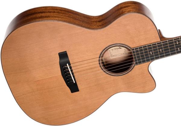 The Flow Series is the result of expertly carried out research and tests to launch an innovative guitar series most suited for fingerstyle artists and enthusiasts. The OM body sized CORT Flow OC features a 25.5”(648mm) neck scale with 1 3/4”(44.5mm) nut width widely regarded as the ‘golden standard’ among fingerstyle players for its optimal string spacing and string tension. And with its completely redesigned asymmetric neck profile, the playing experience is more comfortable yet faster and facilitates more versatility than ever. The solid red cedar top combined with solid- mahogany back and sides provides deep and warm lows and mids with clean tone definition in the highs, and the use of L.R. Baggs® Anthem dual source system ensures lively and natural tones for any style of playing when plugged in.