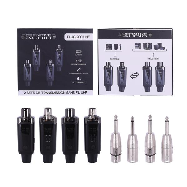 The PLUG 200 UHF is a wireless set for microphone or line signal composed of 2 transmitters and 2 rechargeable receivers in XLR format. They operate in UHF on the 584-608MHz frequency band. They have 15 selectable frequencies and have a range of approximately 50M.