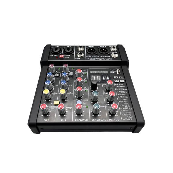The TM 22 BU-USB is a 5-channel analogue mixer, with 2 XLR/Jack 6.35mm combo inputs and a 3.5mm stereo AUX input. It also features a Bluetooth receiver and USB recorder/player. The mic preamps are of the highest quality, so you can be sure of flawless performance. It's equipped with a digital multi-effects with 99 presets, including all the main effects you'll need for normal use.