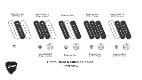 - 3-way toggle that selects between the middle pickup soloed (ultra-fat and punchy “P” mode) - middle + bridge/neck blend - blend only