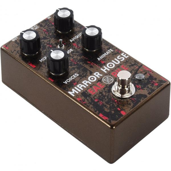 This ELECTRONIC AUDIO EXPERIMENTS Mirror House v2 was upgraded with lower noise, soft switching, improved envelope tracking and a third mode called “Flutter”, which trades the envelope functionality for a random LFO to provide a semblance of normality within the pedal and tie the whole thing together.
