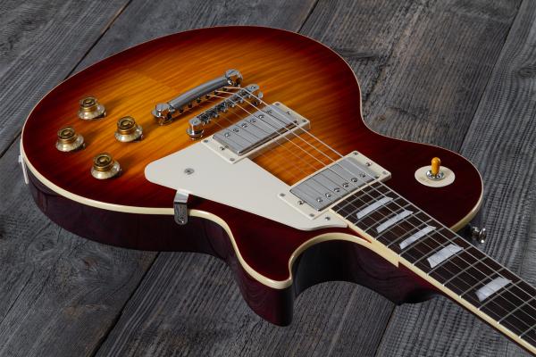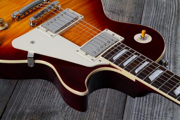 Made in partnership with Gibson Custom, the EPIPHONE Limited Edition Inspired By Gibson Custom Collection 1959 Les Paul Standard Reissue (ECLPR9SFNH1) delivers vintage Les Paul looks and performance at an accessible price. All of the classic appointments the 1959 Les Paul Standard model is known and loved for are present here, including a one-piece mahogany neck with a long neck tenon for increased stability and sustain, an authentic 1959 Rounded Medium C neck profile, and a bound rosewood fretboard. It also features mother-of-pearl trapezoid fretboard inlays, an aged mother-of-pearl Epiphone headstock logo, and the words “Les Paul Model” silkscreened in gold on the Gibson-style “open book” headstock. Even the side dot position markers are the same size as on vintage 1959 Les Paul Standard models and are placed in historically accurate locations. The genuine mahogany body features a carved maple cap that is topped with a beautiful AAA flamed maple veneer.