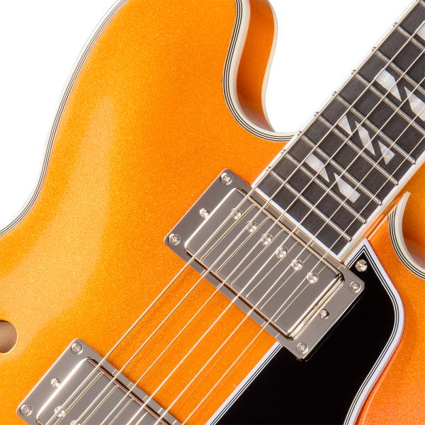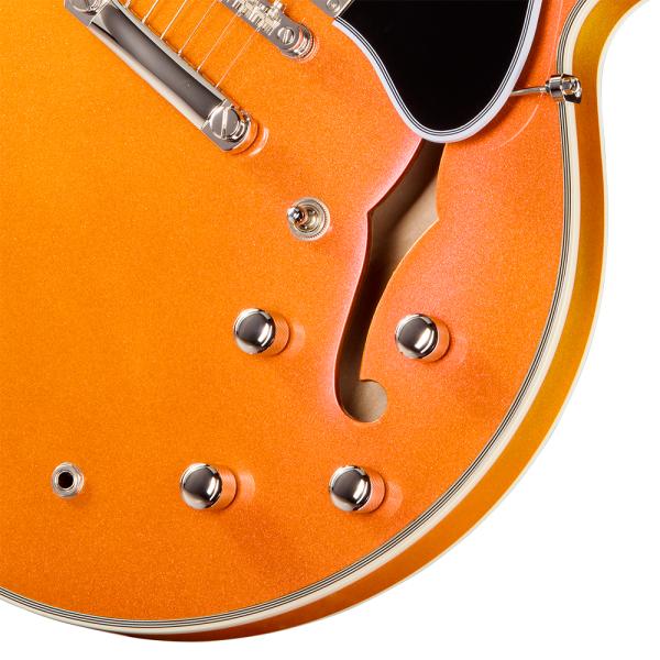The Futura ES-355 is a semi-hollowbody model featuring a solid maple centerblock with a weight-relief window for enhanced sustain and improved feedback resistance while remaining lightweight and comfortable to hold and play.
