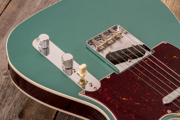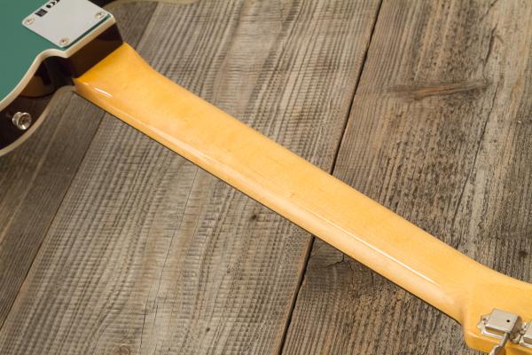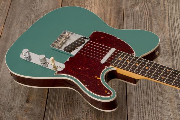 Developped around a "1960 Telecaster Base Model",FENDER Custom Shop Time Machine 1959 Telecaster Custom Time Capsule Sherwood Green #R146032 (9237002904) solid body electric guitar features 2-pieces "sort for lightweight" Alder body, quarter-sawn Maple neck and AAA "sort for dark" Rosewood fretboard (1959 Large C profile, narrow-tall frets, 9.5" radius), Custom Shop Hand-wound '58 Tele pickups and traditional/vintage-style parts.