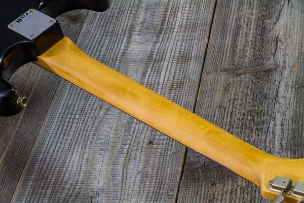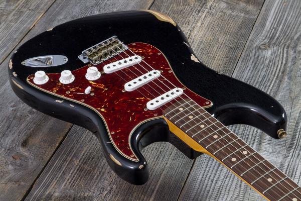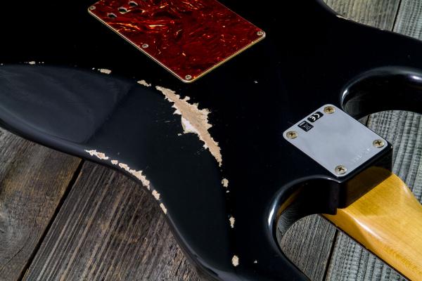 Developped around a "1960 Stratocaster Base Model",FENDER Custom Shop Time Machine 1963 Stratocaster Relic Black Over HLE Gold #R143861 (9237003351) solid body electric is the reinterpretation of a typical mid-sixties typical Strat. It merges vintage and modern specs.