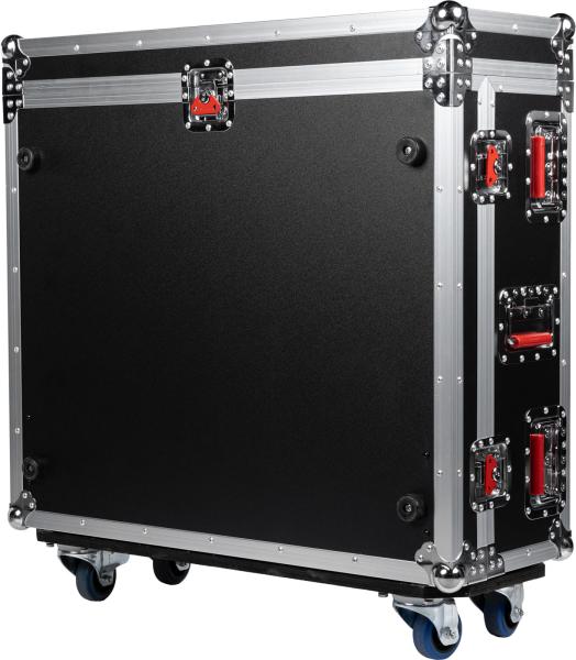 Gator's iconic red recessed latches and rubber-coated spring-loaded handles ensure secure closure and a comfortable grip. The integrated wheeled tray, equipped with two wheels with brakes, enables smooth, stable and effortless transport, even over long distances.