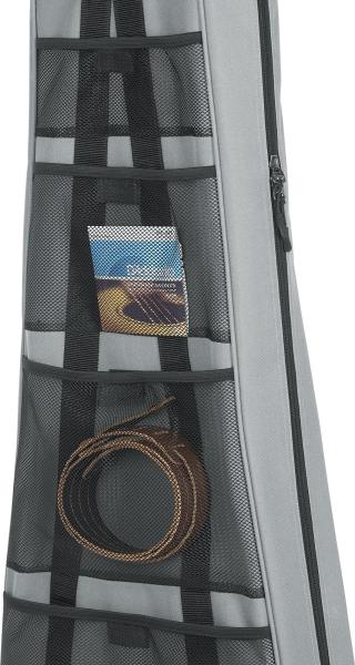 The rugged gray polyester fabric exterior and soft knit inner lining protect your instrument from damage when it comes into contact with other objects in your closet, while keeping dust out. A built-in ventilation grommet is also included to ensure adequate humidity levels during prolonged storage. Mesh pockets with hook-and-loop fasteners on the back of the bag offer additional storage for accessories such as a tuner, strings and picks.