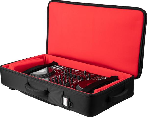 The Gator Cases ICON Series G-ICONDJ-LG-BP bag is specially designed for large DJ controllers, offering rugged protection, smart organization and stylish design for DJs on the move. Its semi-rigid, multi-layer construction combines a weather-resistant black 1000D nylon exterior with a soft red knit interior, guaranteeing optimum protection for your equipment.