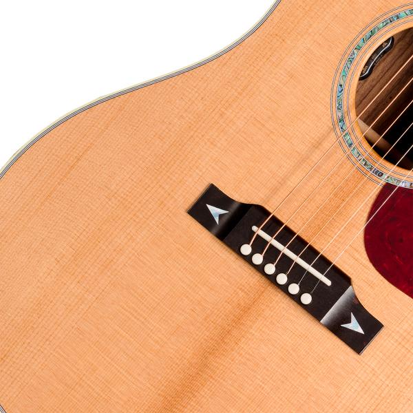The neck has a compound dovetail joint and is attached to the body using hot hide glue for a stable connection and maximum tonal transfer. The bound headstock has a rosewood veneer that features the Gibson logo and Crown inlaid in mother-of-pearl. The nut is bone, and high-quality gold Grover® open-back tuners are fitted. The bridge is also ebony and is equipped with a bone saddle and TUSQ® bridge pins, and decorated with mother-of-pearl arrow inlays. The thermally-aged Sitka spruce top is protected by a custom line tortoise pickguard and features a wide abalone rosette.
