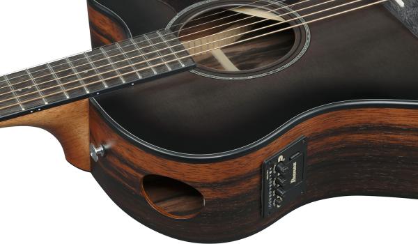 IBANEZ Advanced Acoustic AAM70CE TBN is a proprietary Auditorium with cutaway acoustic/electric guitar featuring solid Sitka Spruce top, layered Macassar Ebony back/sides, Okoume neck, Purpleheart fretboard and Ibanez Custom Electronics preamp w/Onboard tuner.