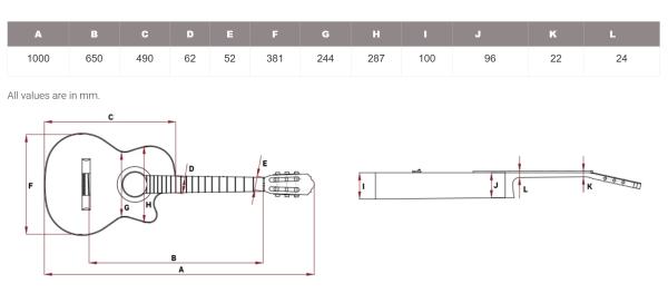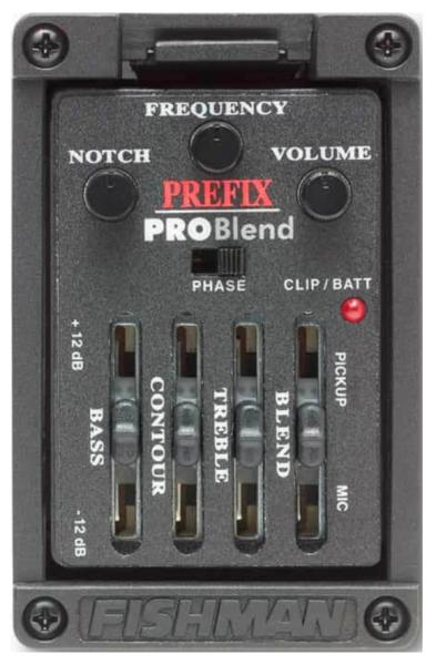 It is equipped with a cutaway and a Fishman Prefix Pro Blend featuring an Internal microphone and a blender for Pickup/Mic signals.