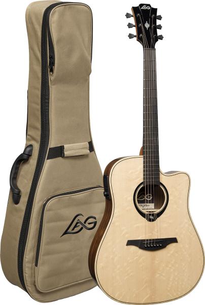 The very attractive LAG Hyvibe H2 HV30DCE is a Dreadnought steel string acoustic/electric guitar featuring solid Bearclaw Spruce top, solid Bocote back/sides/neck and Black Brankowood fingerboard/bridge. It benefits from excellent craftmanship, and provides warm, rich and dynamic sounds.