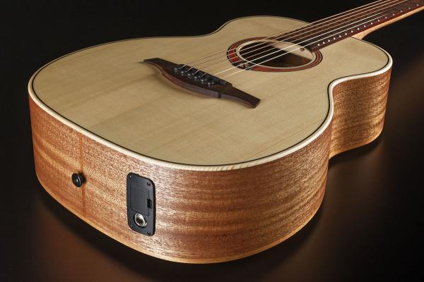 With its included gig bag, LAG Travel T70TE is a small body / short-scale acoustic guitar featuring solid Sitka Spruce top, Khaya back/sides, Okoume neck and Brown BrankoWood fretboard.