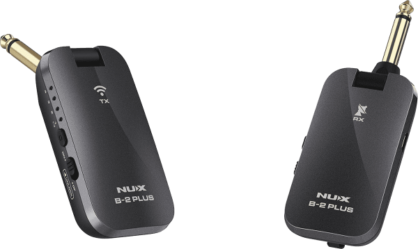 Specifically designed for guitarists looking to free themselves from the constraints of a cable, the Nux B2-Plus is a high-fidelity digital wireless transmission system perfect for home or studio use. The transmitter and receiver are equipped with a high-capacity lithium-ion battery, giving the system up to 20 hours of battery life, or 7 hours of continuous playing (compared to 6 hours for the B2). The B2-Plus features an Auto Sleep mode for automatic shutdown to conserve battery power. The modules can be charged via the included USB cable, while the transmitter and receiver are paired using the small clip on the back. The B2-Plus's clever design allows it to be easily mounted on both Strat-style instruments with a recessed jack input and a vibrato, and Les Paul-style models with a traditional jack input.
