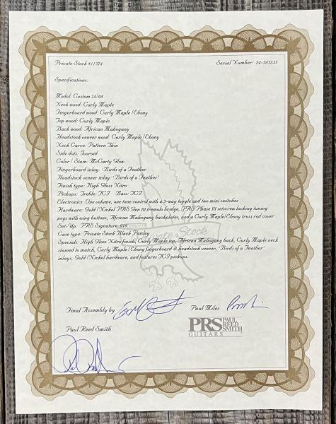 Private Stock represents the highest quality of materials, the most personally crafted instruments, and the greatest level of customization available from PRS. This PRS USA Private Stock Hand-signed Custom 24-08 #0385255 is an exceptional solid body electric guitar. Designed by the most skilled PRS's artisans, it is a delight for eyes and ears. It stands out with an amazing fretboard merging curly Maple and Ebony.