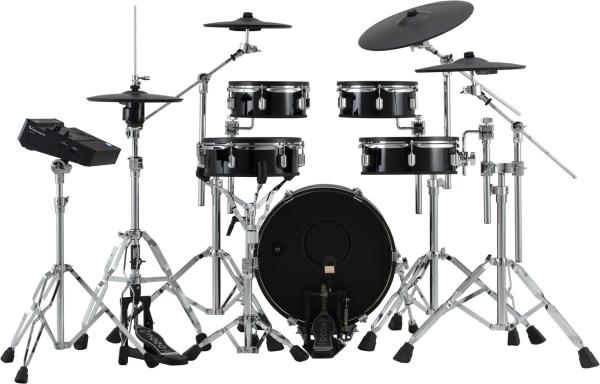 - Acoustic Design V-Drums with five reduced-depth wooden drum pads, including a standard-diameter bass drum