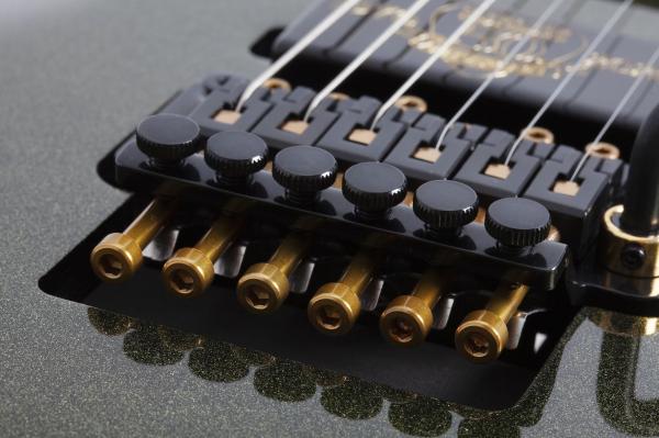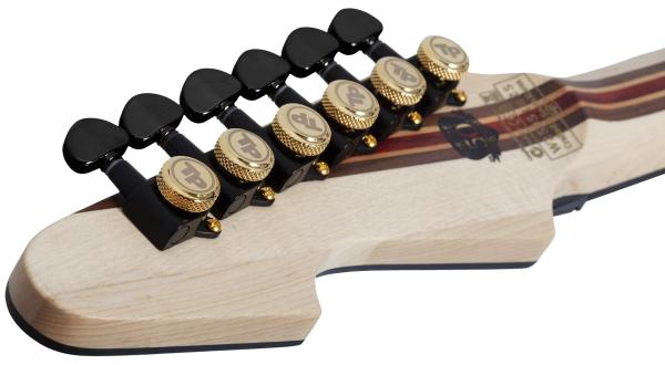 The ebony fingerboard is adorned with bold offset brass ring inlays, while the ultra-thin “C” neck shape and 12”-16”compound radius ensure unmatched speed and comfort. With 24 X-Jumbo stainless steel frets, durability and precision are taken to the extreme.