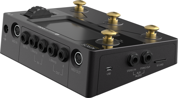With its 4 comfortable gold-finish footswitches, the Aeros gold has been designed to be ergonomic and intuitive, making it very comfortable to use in any situation. An integrated scroll wheel lets you easily control the volume of your loops with your foot, giving you total control over your performance and your mix in real time, thanks to the 4.3" touchscreen. The Aeros is built in a sturdy aluminum chassis and a black, mark-resistant finish to withstand the most demanding studio or live sessions.